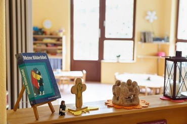 Das Kitajahr ist geprägt von Tischgebeten, Geschichten aus der Bibel, dem Kirchenjahr und den damit verbundenen Festen. Einmal in der Woche kommt Pfarrer Schwarz in die Kita, um mit den Kindern zu singen und Geschichten aus der Bibel zu erzählen.